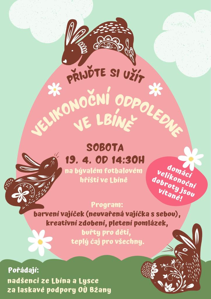 V sobotu 19. dubna od 14:30 proběhne akce zaměřená na barvení vajíček a kreativní zdobení. Účastníci si mohou přinést neuvařená vajíčka a zapojit se do pletení pomlázek. Pořádají nadšenci ze Lbína a Lysce s podporou obce Bžany.